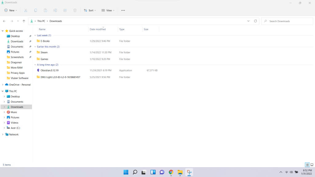 ただし、デフォルトのレイアウトはフォルダの種類に応じて自動的に変更されます。例えば、「ダウンロード」フォルダを開くと、古き良き「詳細」ビューが表示されます。