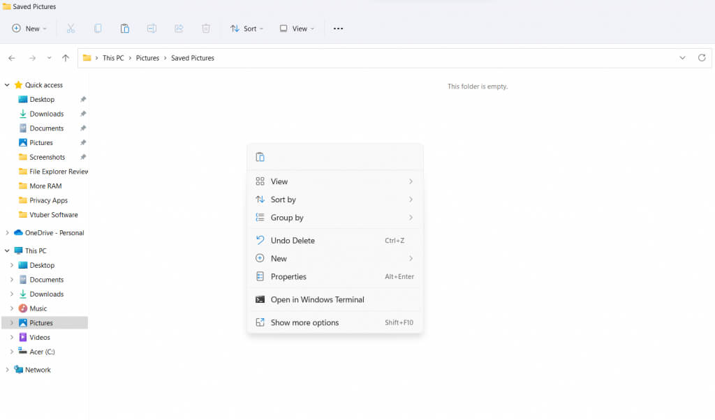 それだけではありません。ファイルをコピーした後、任意のフォルダ内の空白部分を右クリックすると、貼り付けオプションを含む別のコンテキストメニューが表示されます。Windows 11のファイルエクスプローラーでは、貼り付けアイコンはクリックした場所の近くに表示されますが、コンテキストメニュー自体は画面中央に残ります。