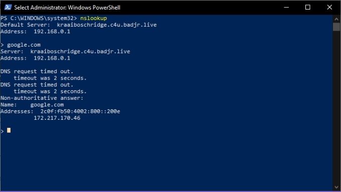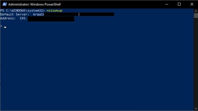 NSlookupはまだ実行中であり、PowerShellではなくNSlookupのコマンドラインにいることに注意してください。PowerShellに戻りたい場合は、「NSlookup」と入力してください。 終了する を押して 入力します.