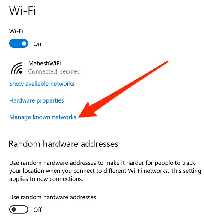 - 次の画面でクリックします 既知のネットワーク管理 右側にネットワークが表示されます。