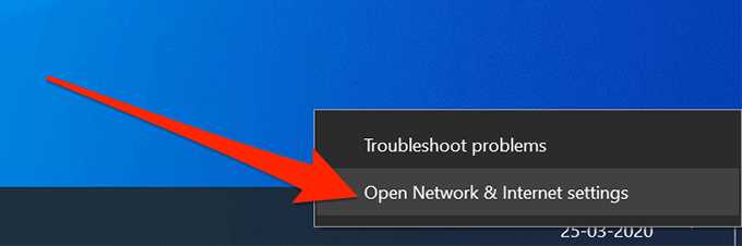 - システムトレイのネットワークアイコンを見つけて右クリックし、 ネットワークとインターネットの設定を開く.