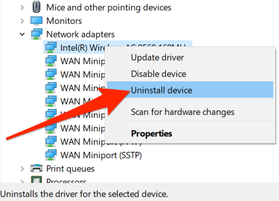 - リストを展開する ネットワークアダプタ それをクリックします。次に、リストからワイヤレスアダプタを選択し、右クリックして デバイスをアンインストールします.