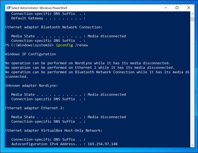 - PowerShellターミナルウィンドウで、次のように入力します。 でipconfig /リリース DHCPリースを解放して切断するには、新しい設定を適用して次のように入力します。 IPCONFIG / RENEW 再接続します。