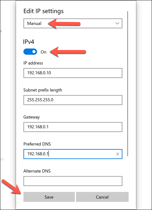 - IP割り当てタイプを次のように変更します マニュアルどちらかをアクティブにする IPv4 أو IPv6次に、適用したい静的IP設定を入力します。静的IPアドレスの設定例にはIPv4が含まれます。 192.168.0.10 IPアドレスの場合、 24 サブネットプレフィックスの長さについては、 192.168.0.1 ゲートウェイ(ローカルルーターを参照)と優先DNSサーバーについては、 保存する 終わったら。
