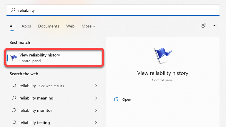 信頼性モニターはスタートメニューで検索して開くことができます。 信頼性 スタートメニューの検索バーで、 信頼性履歴の表示 (信頼性履歴を表示) Windows 10 または 11 オペレーティング システムで。