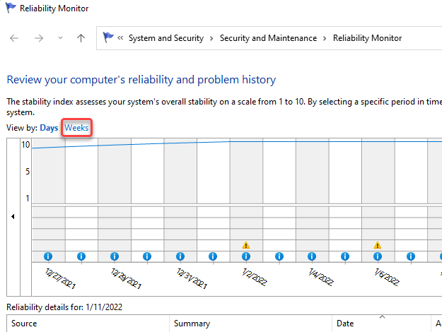信頼性モニターを開くと、右端に現在の日付と各日のイベントが表示される日次列が表示されます。[該当するセクション/セクション]を選択すると、週次表示を選択することもできます。 ウィークス 左上から。