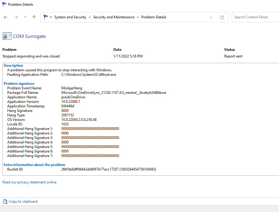 重要なイベントも下に表示されます。イベントをダブルクリックすると、発生した理由の詳細を確認できます。例えば、次のケースでは、イベントログにOneDriveが原因でWindowsが応答を停止したことが記録されています。