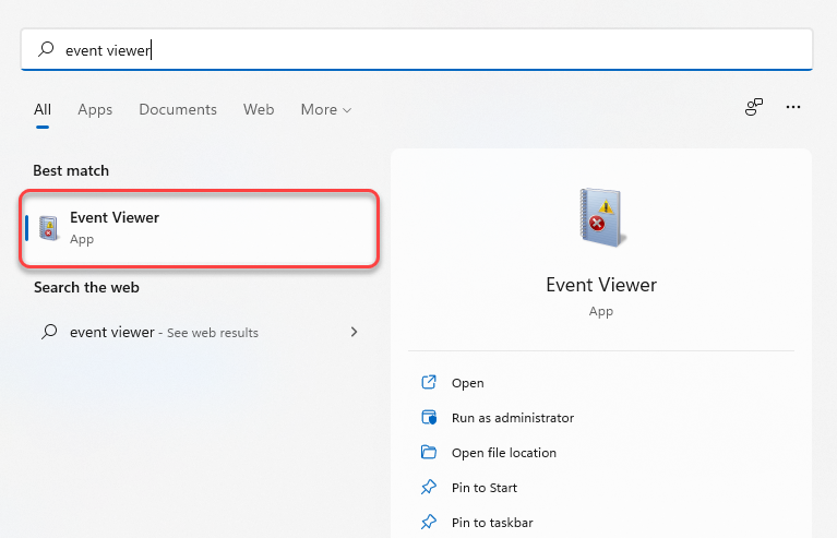 Windows 10と11の両方でイベントビューアーにアクセスするには、次のように入力します。 イベントビューア スタートメニューの検索ボックスで、 Enter 「ベストマッチ」を決定します。