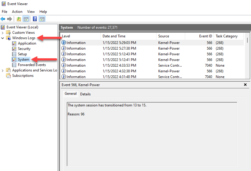 イベントビューアーを起動すると、左側のサイドバーにリストが表示されます。次のセクションには、ブルースクリーン(BSOD)やその他のコンピュータークラッシュのクラッシュログが表示されます。 Windowsログ > しつけ (Windows ログ > システム)。