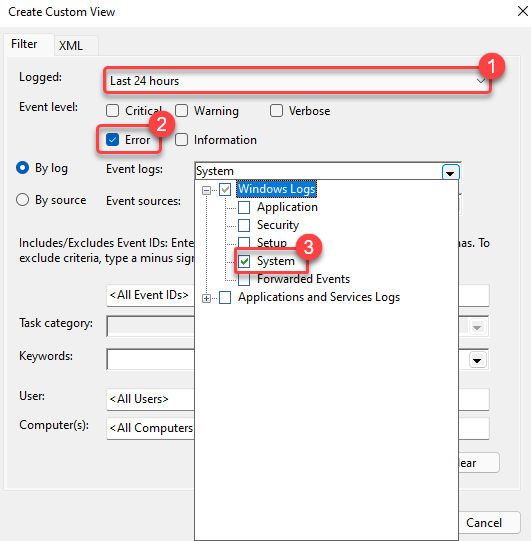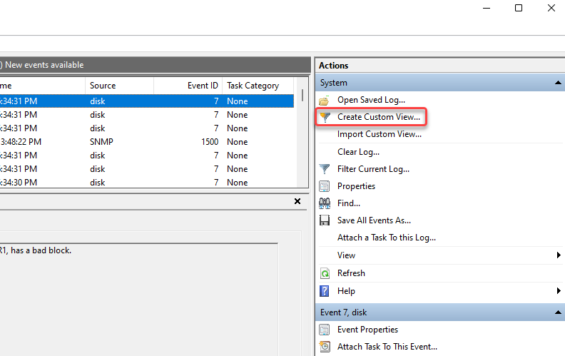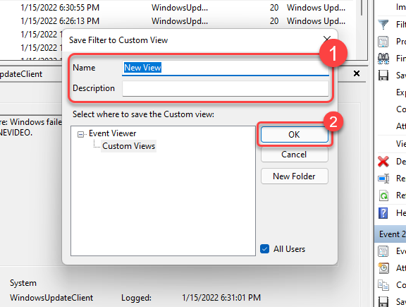 あるいは、カスタムビューを作成して、重要なイベントをフィルタリングして見つけることもできます。これを行うには、 カスタムプレゼンテーションを作成する イベント ビューアーの右側のサイドバーに新しいウィンドウが表示されます。