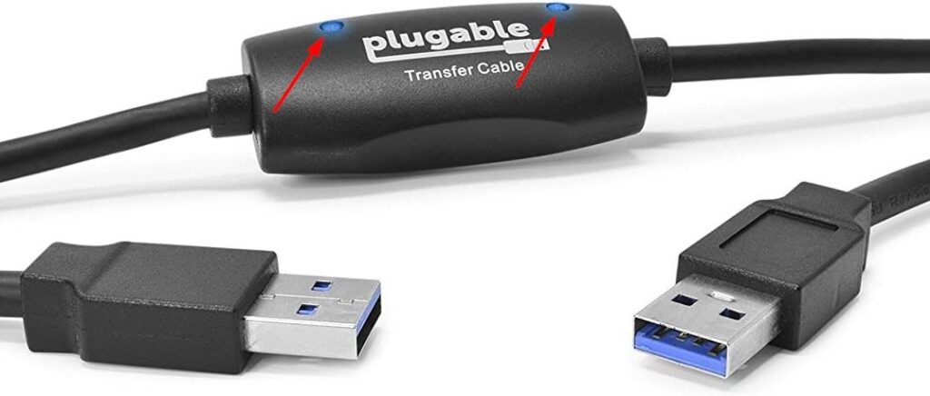 - ほとんどのUSBケーブルには、ケーブルのどこかに2つのLEDが付いています。コンピュータが正常に接続されると、LEDが点灯してその状態を示します。例えば、Plugable社のUSBケーブルは次のようになります。