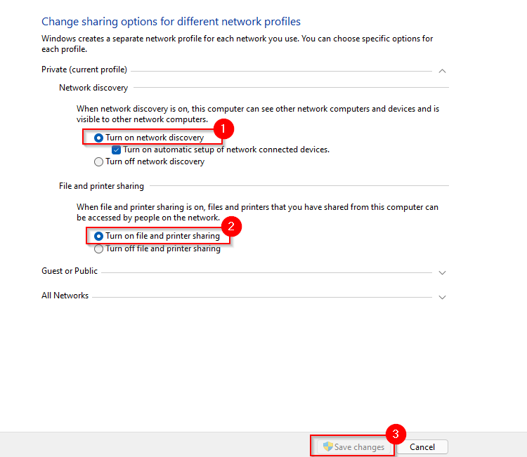 - 次に、プロファイルの設定を展開します。 プライベート自宅または職場のネットワークでのみファイルを共有する場合は、それらの横にあるラジオ ボタンを選択します。 ネットワーク探索をオンにする و ファイルとプリンターの共有をオンにする次に、 変更を保存します.