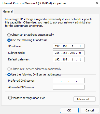 - の横にあるラジオ ボタンを選択します。 次のIPアドレスを使用します次の構成を使用します。
