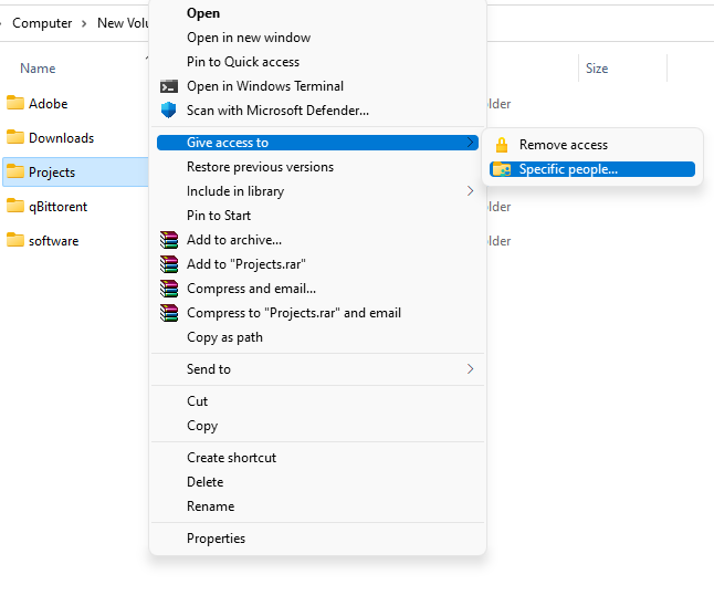 - これでファイルとフォルダを共有する準備ができました。他のコンピュータで共有したいフォルダに移動し、右クリックして「共有」を選択します。 にアクセス権を与える > 特定の人.