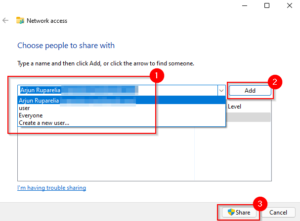 - ファイルを共有するユーザーを選択し、 追加をクリックしてからボタンを選択します シェアする.