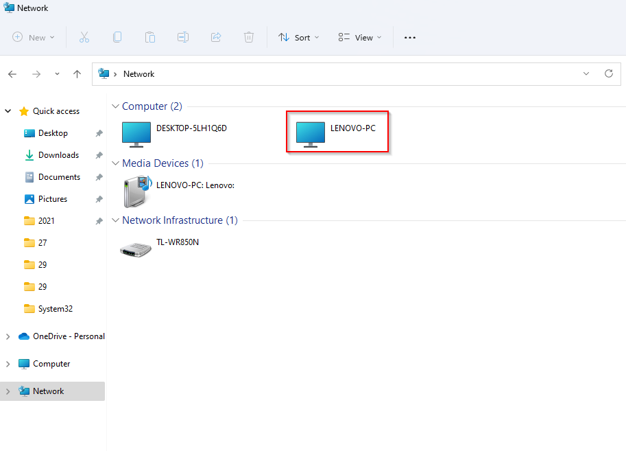 - ここまでに説明した設定は両方のコンピュータに適用する必要があります。完了したら、ファイルエクスプローラーを起動して ネットワーク 左側から。ここにもう1台のコンピューターが見えるはずです。