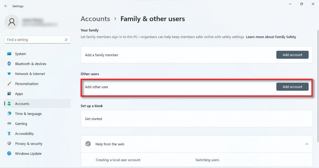 - [その他のユーザー] の下にある [アカウントの追加] ボタンを選択します。