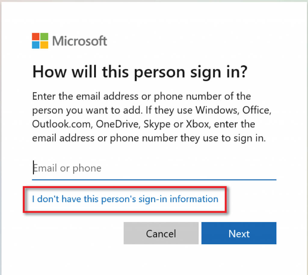 - ダイアログボックスで、「この人のログイン情報がありません」を選択します。
