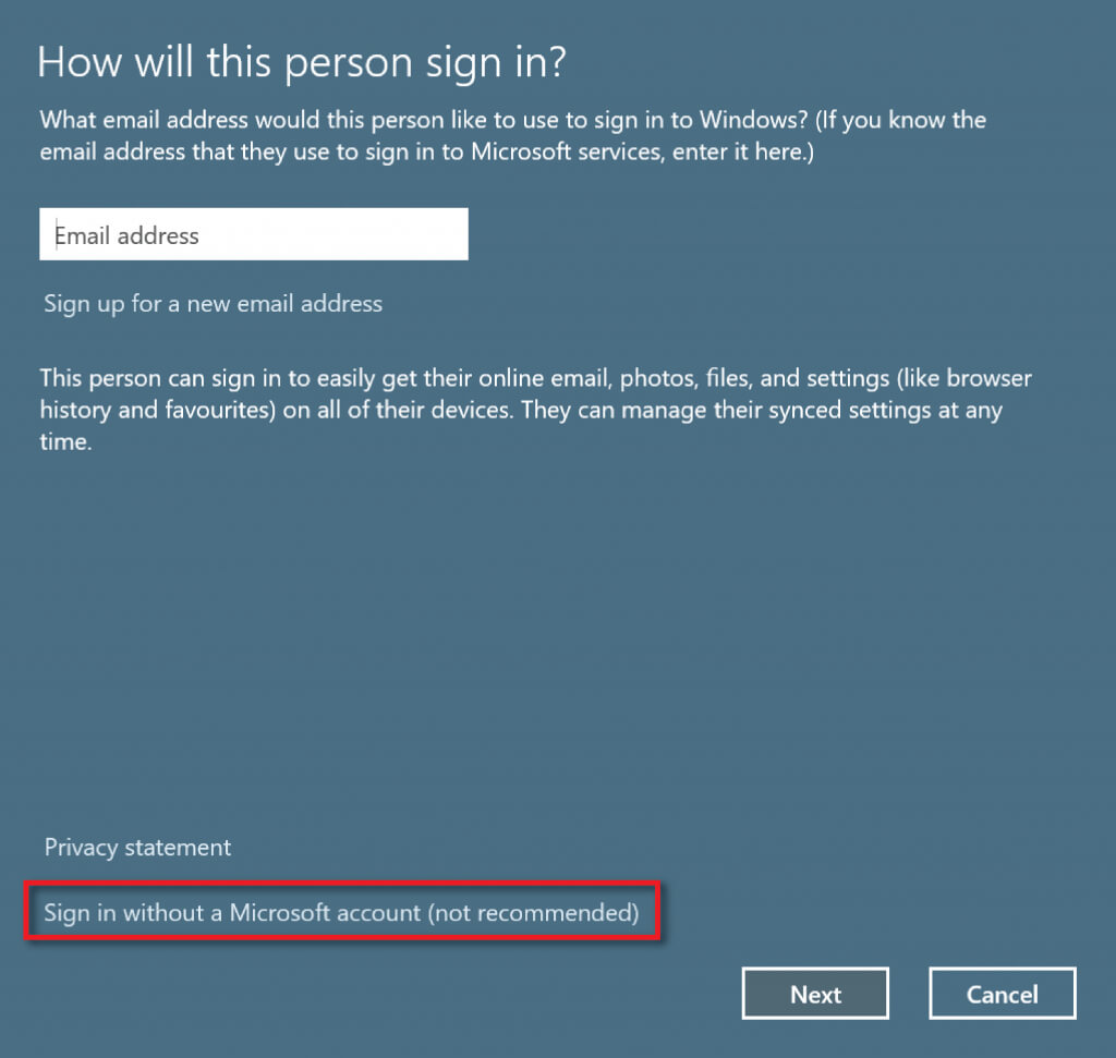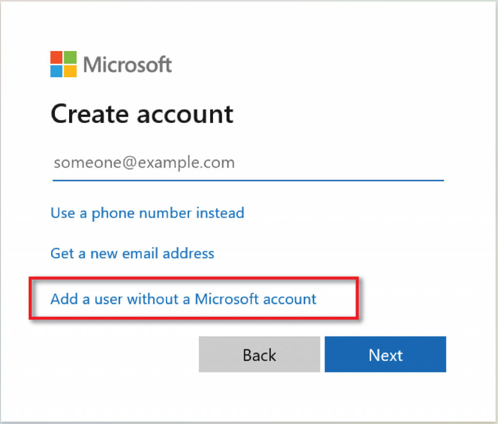 - [Microsoft アカウントなしでユーザーを追加する] を選択し、[次へ] を選択します。