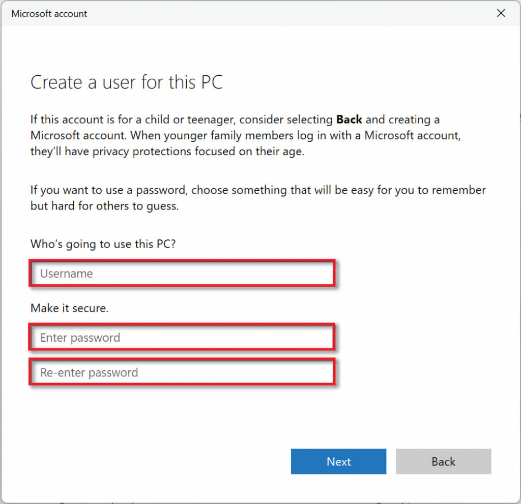 - Windows 11 の新しいローカル ユーザー アカウントに必要なパスワードを入力し、Enter キーを押します。