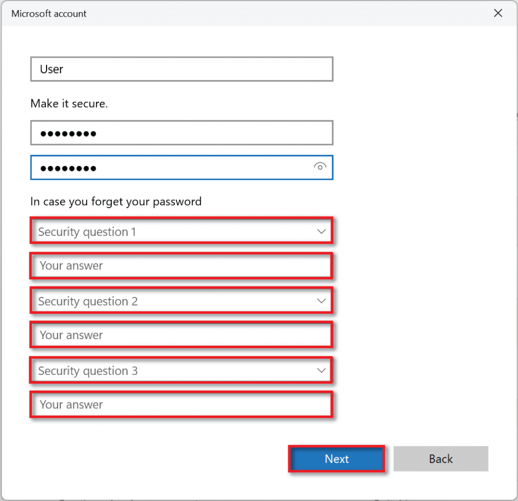 - パスワードを選択したら、下にスクロールして、パスワードを回復するためのセキュリティの質問を設定します。