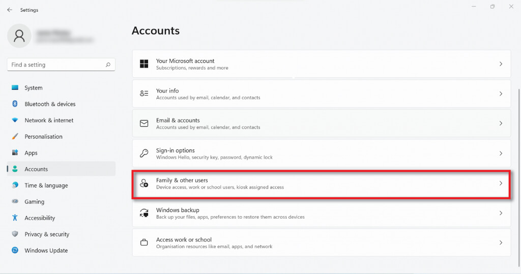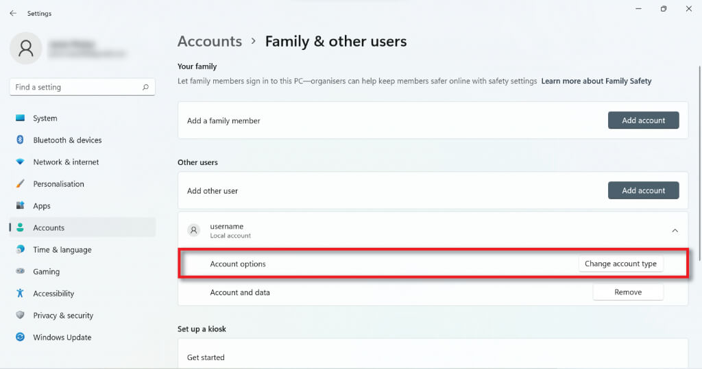 - 新しいローカル アカウントを管理者アカウントに変換するには、[アカウント] > [家族とその他のユーザー] に戻り、[その他のユーザー] の下にあるアカウントを見つけます。