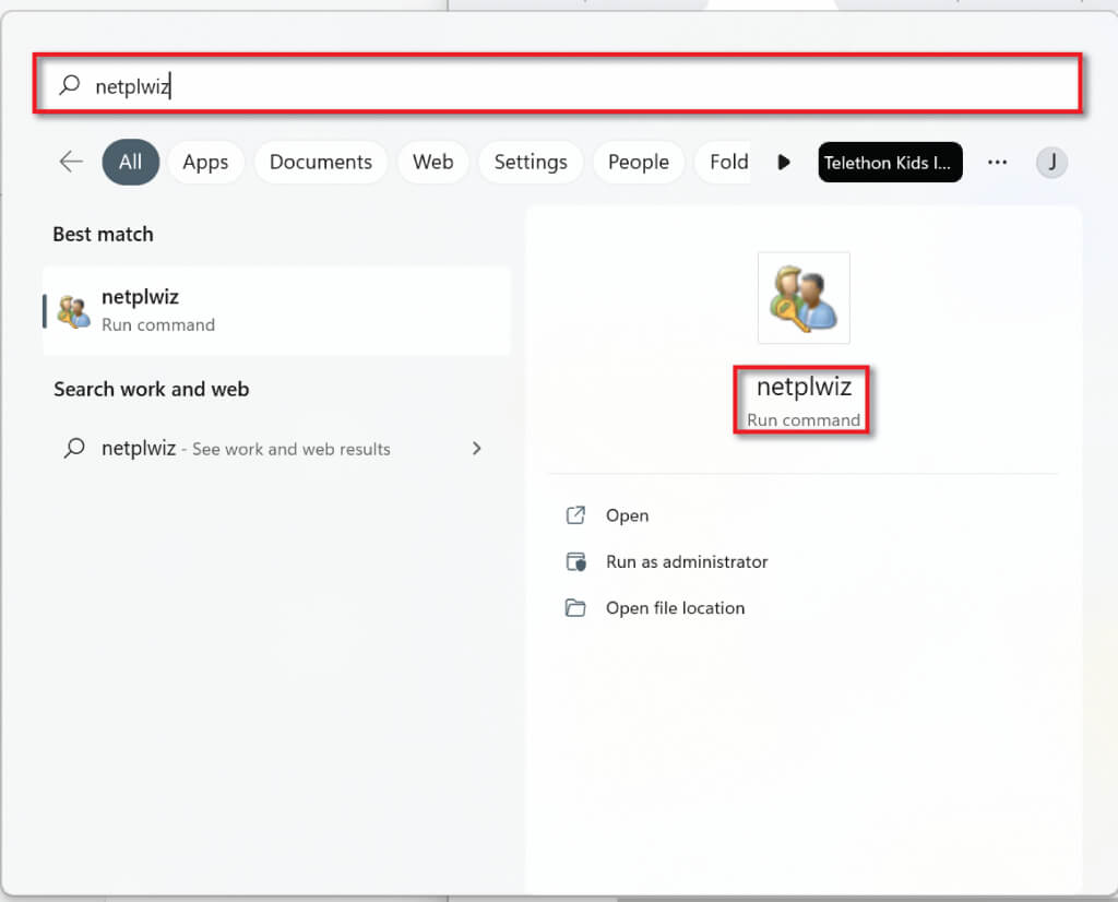 - タスクバーの検索バーに「Netplwiz」と入力し、「コマンド実行」を選択します。