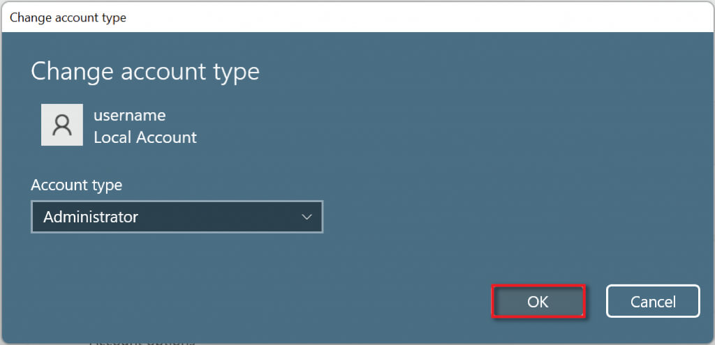 - 右側のドロップダウン矢印をクリックし、「アカウントの種類の変更」ボタンを選択します。新しいダイアログボックスで、「標準ユーザー」を「管理者」に変更し、「OK」を選択します。