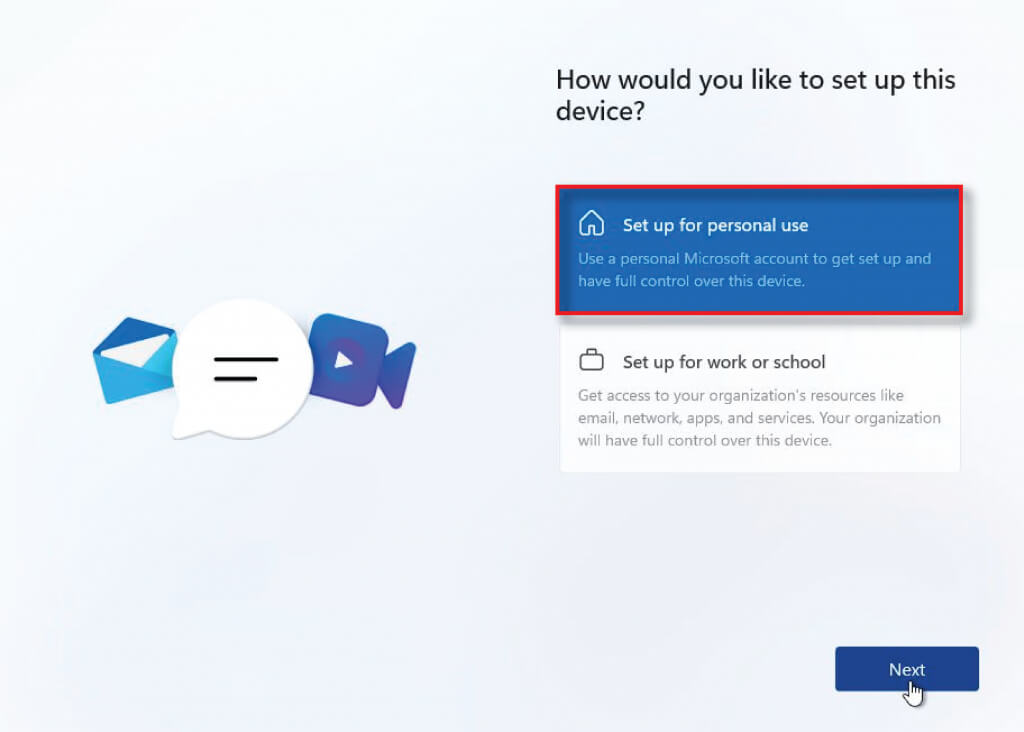 - セットアップ プロセス中に、コンピューターを個人用に設定するか、ビジネス アカウントまたは学校アカウント用に設定するかを尋ねられたら、個人用を選択します。