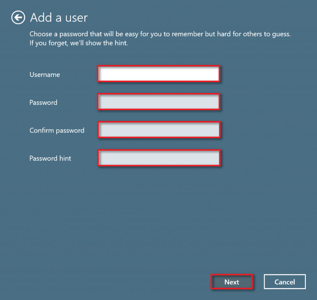 - ユーザー名とパスワードを入力してください。あなただけが知っているパスワードのヒントを入力し、「次へ」を選択してください。
