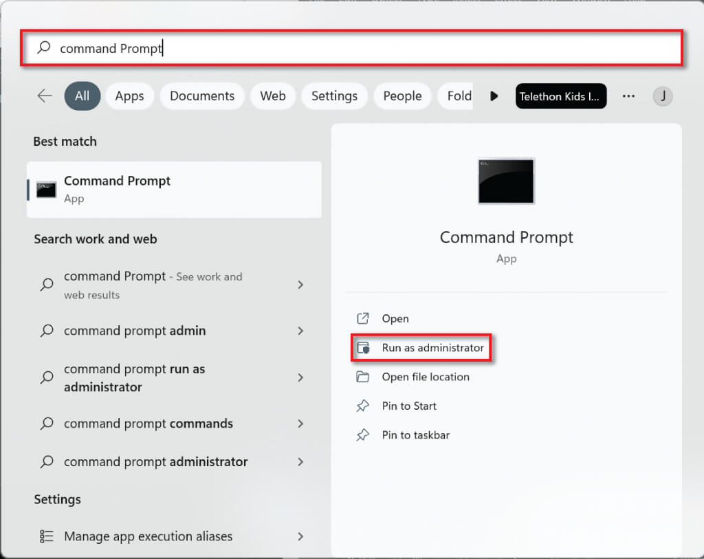 - スタートメニューの検索バーに「cmd」と入力し、「コマンドプロンプト」で「管理者として実行」を選択します。
