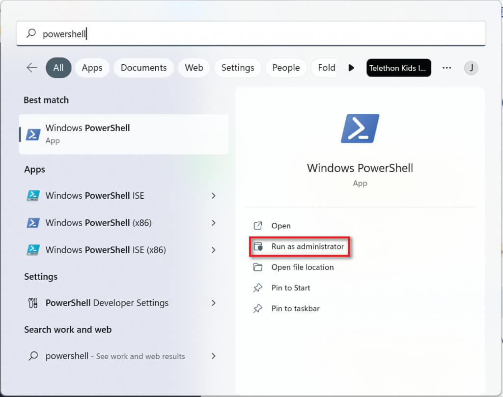 - タスクバーの検索バーに「PowerShell」と入力し、「管理者として実行」を選択します。
