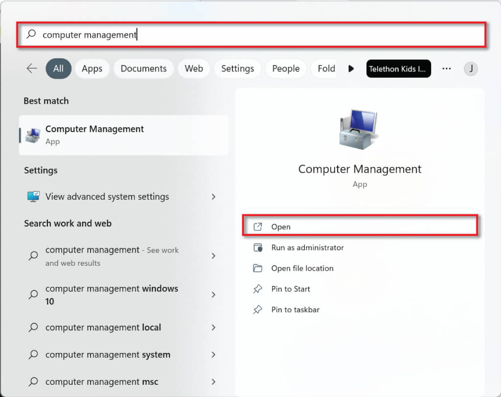 - [スタート] メニューの検索バーに移動し、「コンピューターの管理」と入力して、[コンピューターの管理] を選択します。