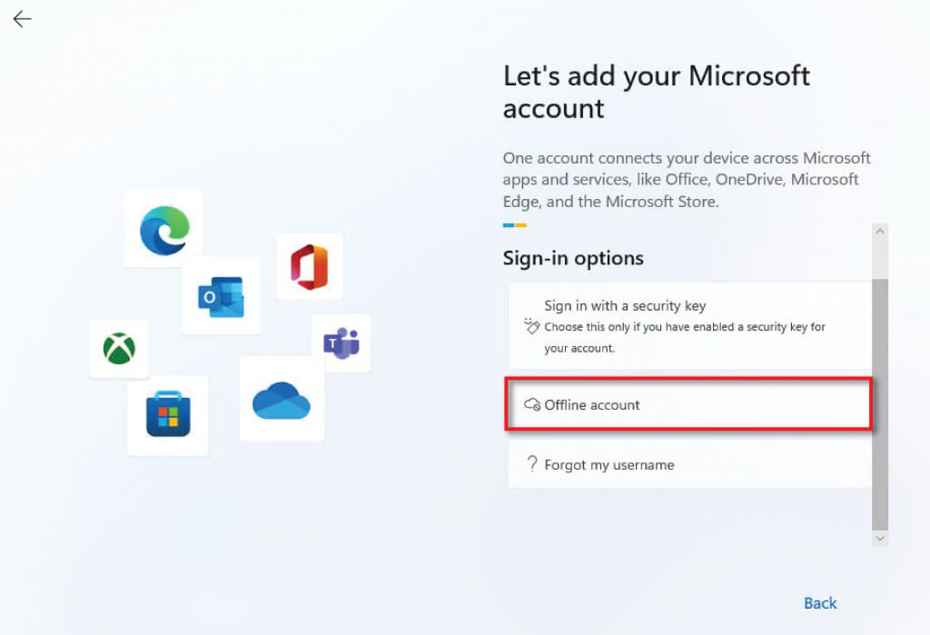 - [オフライン アカウント] を選択し、戻るように求められたら [今はスキップ] を選択します。