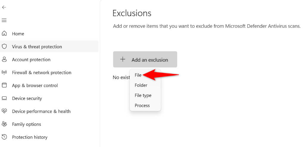 - [例外を追加]を選択し、[ファイル]を選択します。