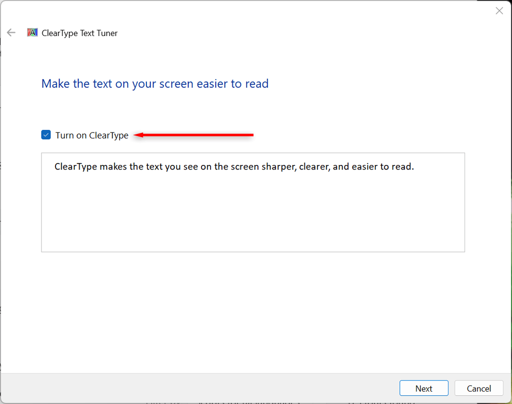 Windows 11でテキストの読み取りに問題がある場合は、ClearTypeが有効になっていない可能性があります。ほとんどの場合、ClearTypeはデフォルトで有効になっていますが、確認してみる価値はあります。この設定を有効にすると、テキストの明瞭度が向上し、読みやすくなります。