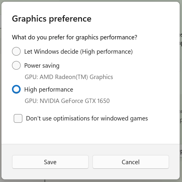- グラフィック設定ウィンドウで、「高パフォーマンス」を選択します。