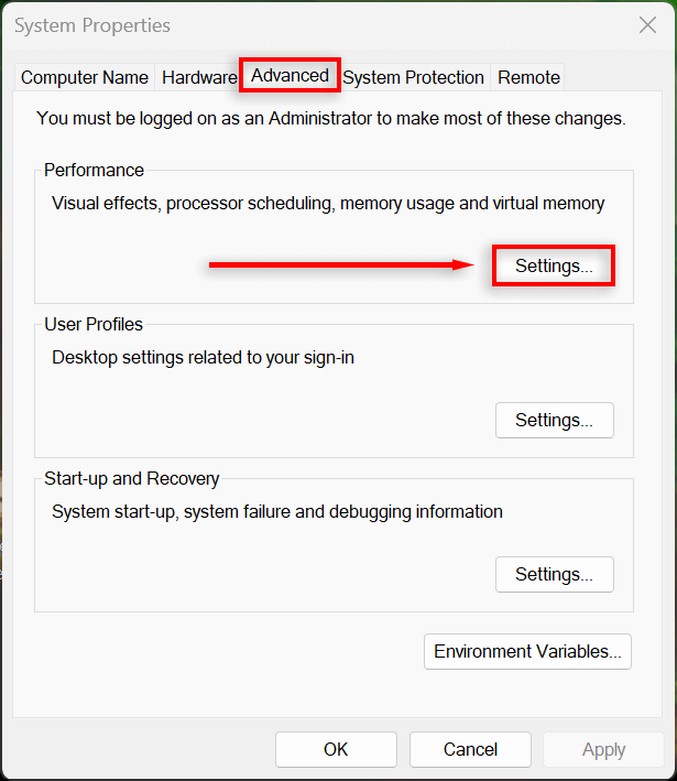 - 「システムのプロパティ」ウィンドウで、「詳細設定」タブを選択します。次に、「パフォーマンス」の下にある「設定」を選択します。