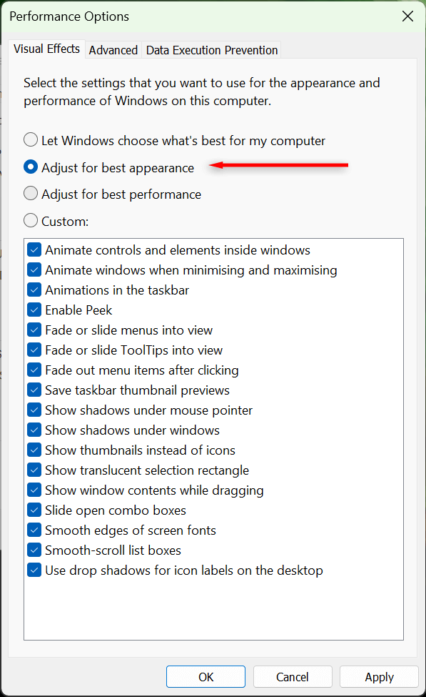 パフォーマンス設定で、Windows にディスプレイを最適な外観に調整させることもできます。