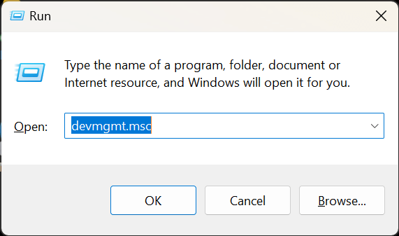 - 「devmgmt.msc」と入力し、Enter キーを押してデバイス マネージャーを開きます。