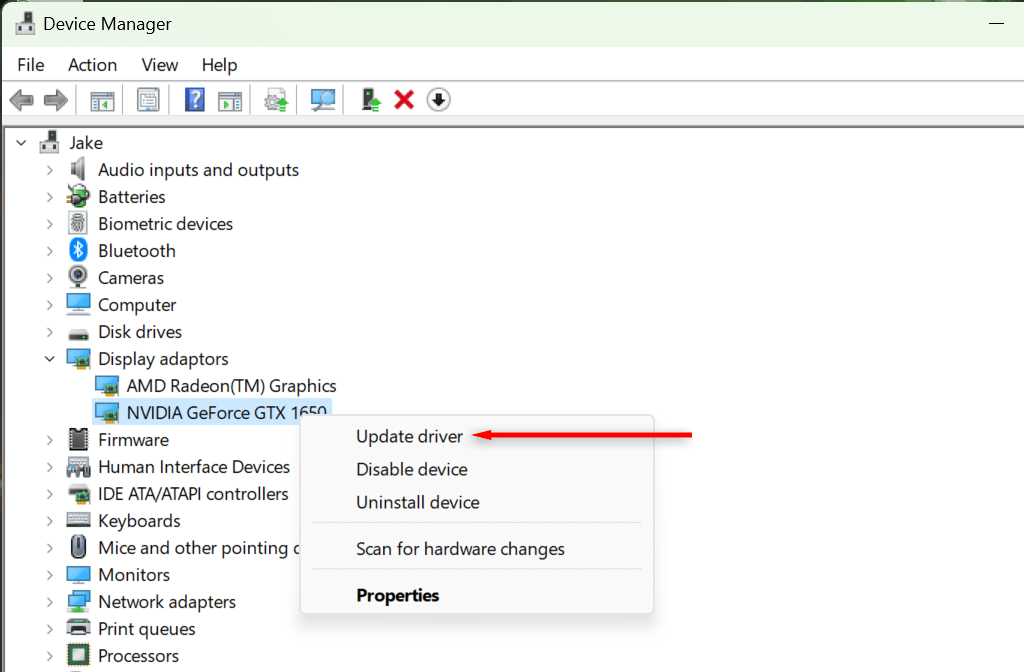 - ディスプレイ アダプターを右クリックし、ドライバーの更新を選択します。