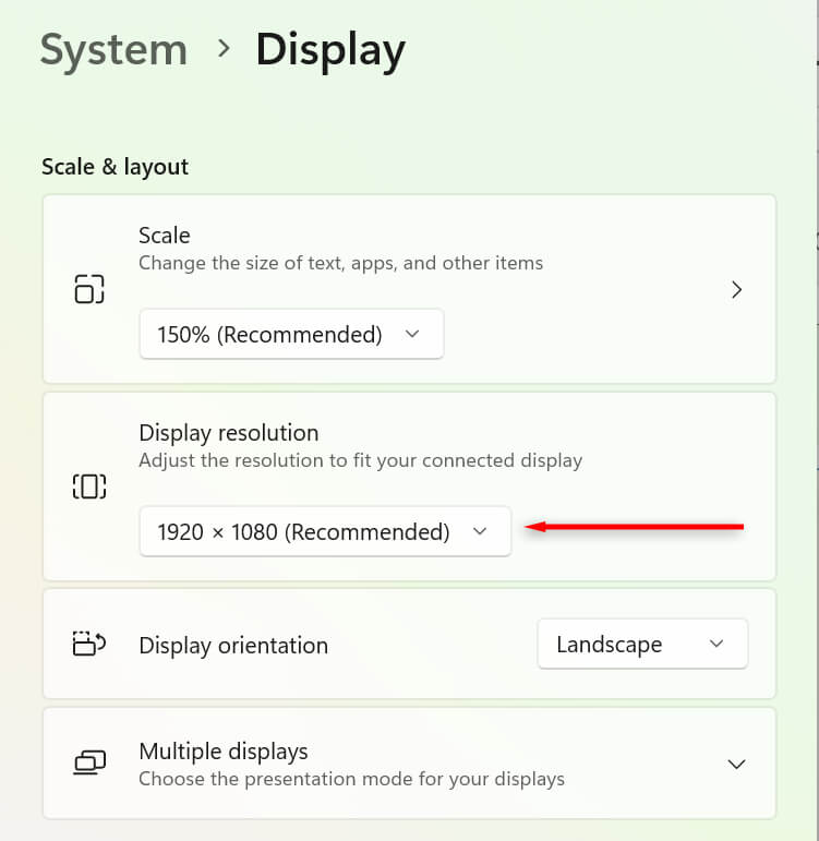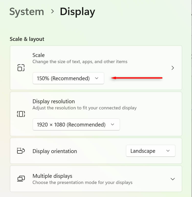 - 次に、「拡大縮小とレイアウト」のドロップダウンメニューボックスを選択し、拡大縮小設定を選択します。画面に最適な設定を見つけるには、少し試してみる必要があるかもしれません。