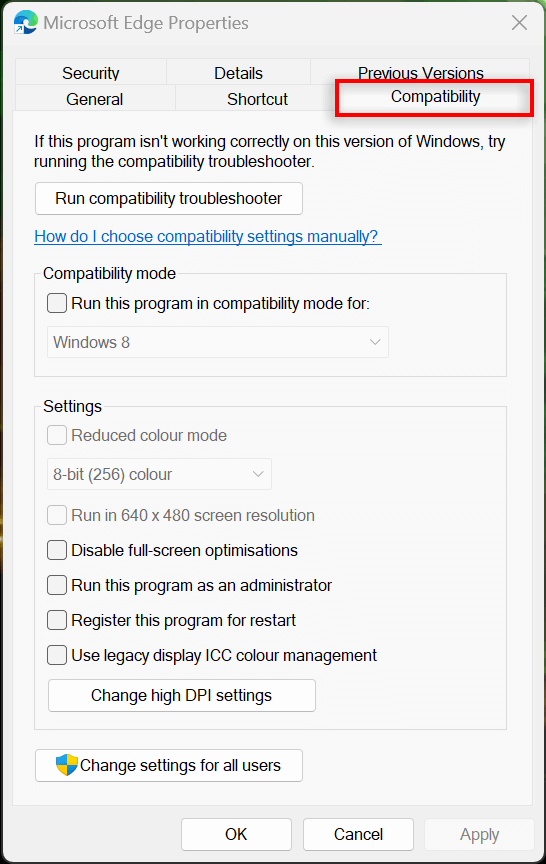- [プロパティ]を選択し、[互換性]タブを選択します。