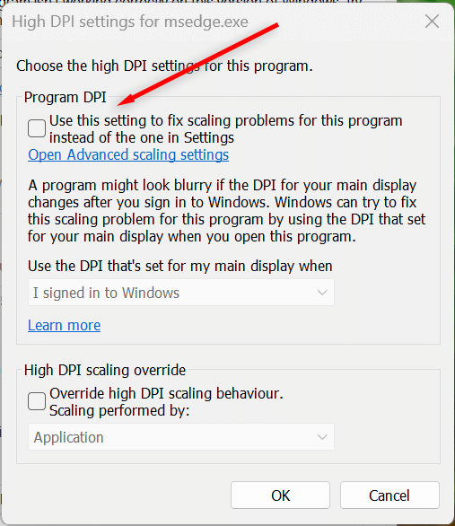 アプリごとにDPIを個別に調整することもできます。これは、画面全体ではなく特定のアプリだけがぼやけて表示される場合に便利です。調整方法は次のとおりです。