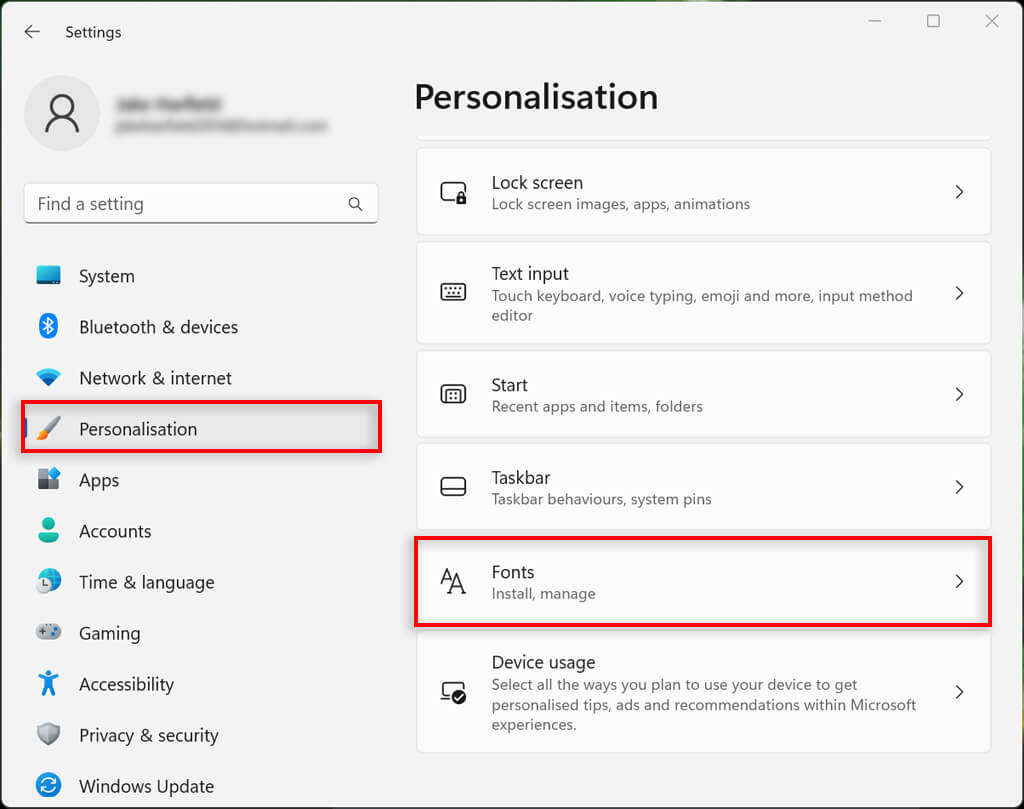 - [カスタマイズ]を選択し、[フォント]を選択します。