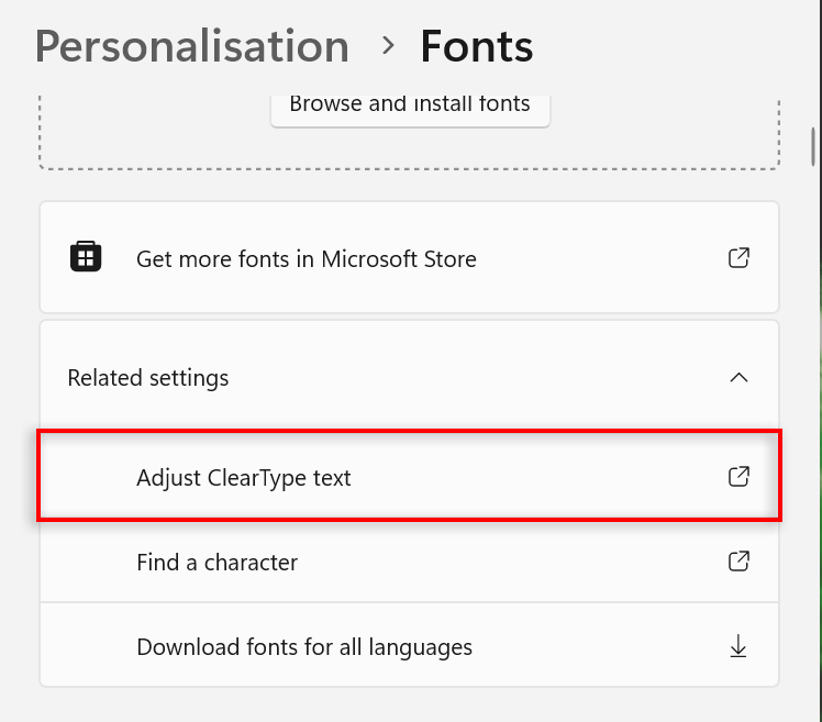 - 関連する設定ドロップダウン メニューを選択し、ClearType テキスト設定を選択します。