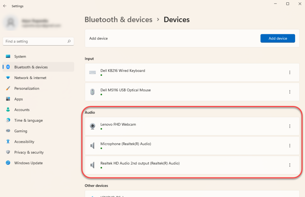Bluetoothヘッドセット、外付けスピーカー、その他のワイヤレスオーディオデバイスをお使いの場合は、コンピューターに正しく接続されていることを確認してください。[ボタン/ボタン/その他]を押してください。 勝利+私 選択します Bluetoothとデバイス.
