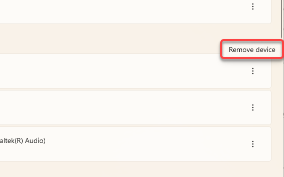 デバイスがコンピューターと正しくペアリングされているかご確認ください。ご不明な場合は、デバイスを一度取り外して再度ペアリングしてください。デバイスの右側にある縦の省略記号アイコンを選択し、[適切なオプション] を選択することで、デバイスを削除できます。 デバイスを削除.