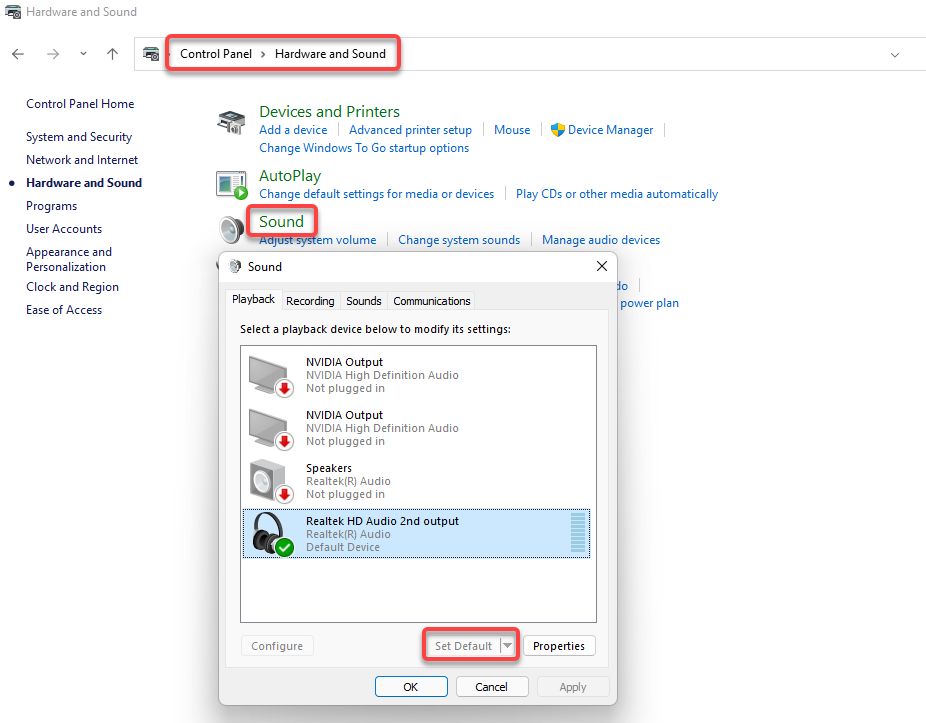 または、別のオペレーティングシステムを選択するには、 コントロールパネル (コントロールパネル)> ハードウェアとサウンド (デバイスとオーディオ) > 音 (オーディオ)タブに移動します。 Playback (オンにする)、デバイスを選択し、ボタンを選択します デフォルト設定 (デフォルトとして設定)以下から選択してください。