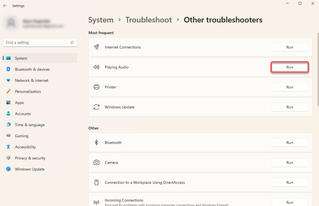 設定アプリにトラブルシューティングツールが組み込まれていますので、タップしてください。 勝利+私 設定アプリを開くには、 システム > 解決します > その他のトラブルシューティングトラブルシューティングツールリストで「 オーディオを再生する ボタンを選択します ラン その隣にあります。